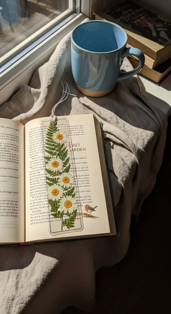 A dried herb bookmark has a natural, earthy beauty that feels warm and calm. Lavender, rosemary, thyme, and small fern pieces work well because they stay thin and flat. Press the herbs first, then seal them in clear adhesive sheets or laminate them between transparent layers. The result looks soft and organic, and it fits perfectly with a cozy reading corner. This idea is especially nice if you like cottage-style decor or natural textures in your room. It also smells faintly lovely at first, which adds something extra to the experience. Use herbs from your kitchen, garden, or a small grocery pack to keep costs low. Add a linen ribbon if you want a bit more detail. The finished bookmark feels handmade and peaceful. It is a small project, but it brings a gentle natural touch to your books and can make everyday reading feel a little more special.