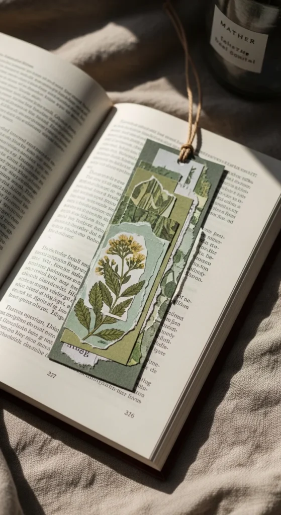 A botanical collage bookmark has a handmade layered look that feels artsy and calm. This is a great choice if you like paper crafts and want to use scraps you already have. Tear small pieces from old magazines, wrapping paper, printed leaf patterns, or craft paper in muted greens and soft neutrals. Layer them on cardstock with glue, then trim the bookmark shape once dry. Keep the layout simple so it still feels clean and usable. A little bit of texture goes a long way. You can also add a pressed leaf or a strip of washi tape for extra detail. This bookmark style is perfect for readers who enjoy journals, nature themes, or creative hobbies. Since it uses leftovers, it is very budget friendly. No two will look exactly the same, which is part of the appeal. It feels personal, relaxed, and lovely tucked into a favorite novel.