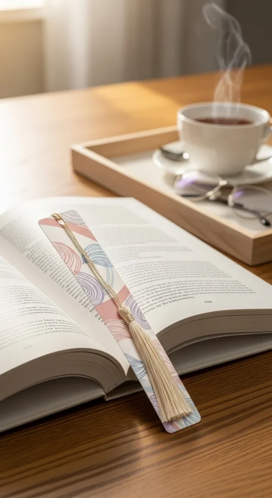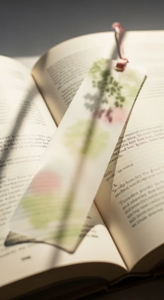 A vellum bookmark has a light and airy look that feels very pretty inside a book. Because vellum is semi-transparent, it gives a soft layered effect when placed over the page. You can keep it plain or add a tiny pressed flower, a simple painted edge, or a small ribbon at the top. This works well if you like subtle, delicate decor rather than bold designs. Vellum sheets can often be bought in small packs, and one pack can make many bookmarks. If vellum is not available, tracing paper can give a similar feeling for less. Just make sure to handle it gently since thinner papers can bend more easily. This type of bookmark looks especially nice with journals, poetry books, and neutral reading setups. It feels calm and refined without being expensive. Sometimes a light, quiet design is exactly what makes a reading routine feel more personal.