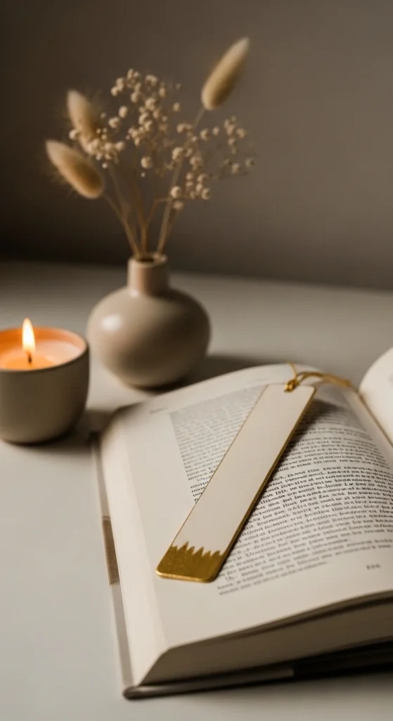 Pressed flower bookmarks have a soft, romantic look that works with almost any reading setup. They feel handmade in the best way, and they are very affordable to create. You can collect tiny flowers from your yard, save petals from an old bouquet, or use small wildflowers from a walk. Press them inside a thick book for a few days, then place them between clear adhesive sheets or laminate them with contact paper. Keep the flowers small so the bookmark stays flat and does not wrinkle your pages. Add a cream or blush ribbon at the top for a finished look. This style feels lovely with poetry books, journals, or bedside novels. It also makes a thoughtful gift. If you want a more polished result, use a neutral cardstock backing first, then layer the flowers on top before sealing. The final look is pretty, light, and easy to make on a small budget.