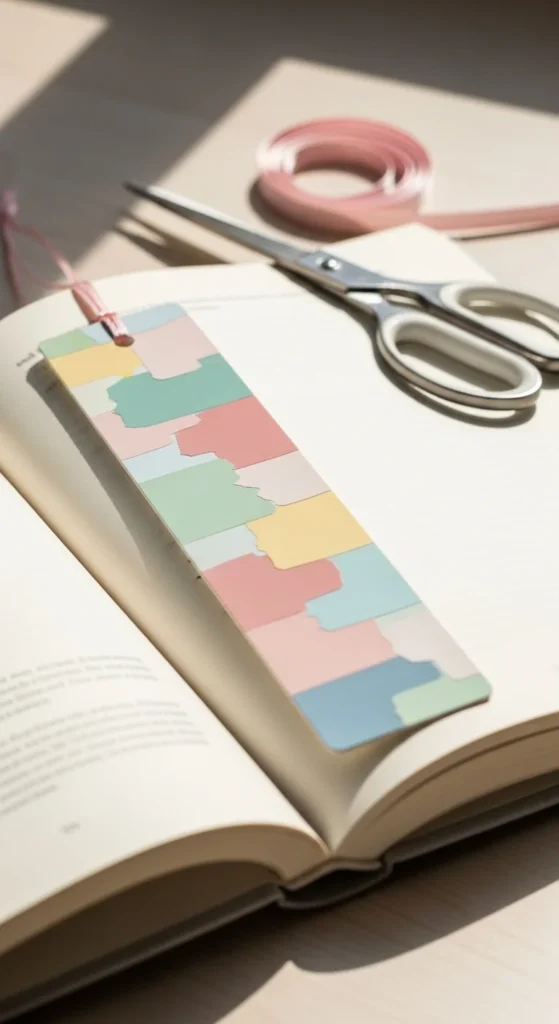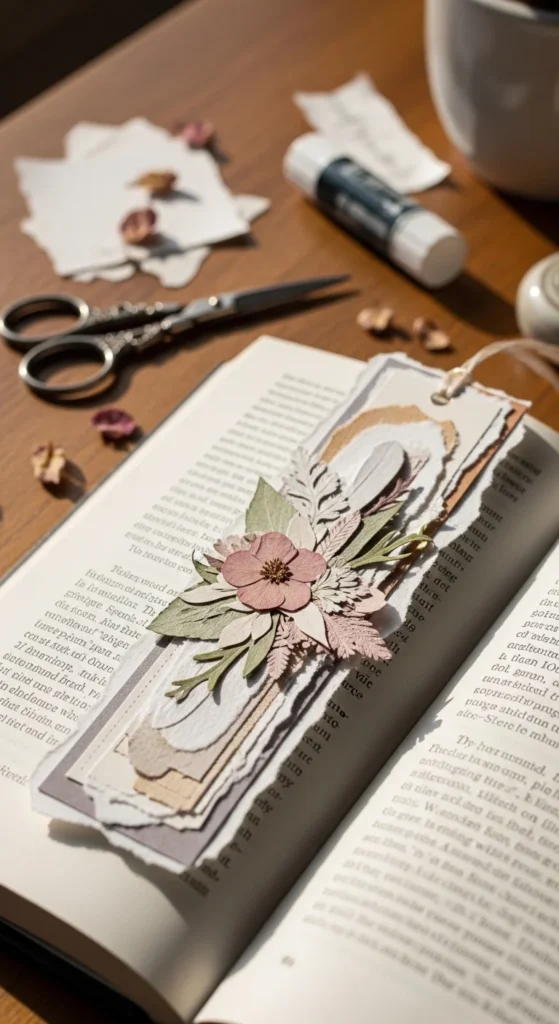 A layered scrapbook bookmark is a good choice if you love paper textures and handmade detail. It lets you mix small scraps of pretty materials into one design that feels personal and creative. Use torn paper, washi tape, old wrapping paper, soft floral pieces, and muted colors to build a simple layered effect on cardstock. Try not to stack too many thick items so the bookmark still fits well inside your book. A few flat layers usually look best. This is a great way to use leftovers from journaling or craft projects, which keeps costs low. It also means every bookmark will look different. You can make one to match your reading corner, your current book cover, or the season. This idea feels relaxed and creative, but it is still practical enough for daily reading. It turns tiny scraps into something that feels charming and useful.
