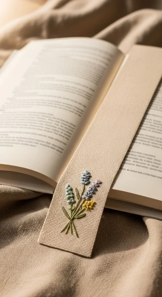 An embroidered bookmark feels soft, thoughtful, and full of charm. You do not have to know advanced stitching to make one look good. A few tiny flowers, stars, or little leaf shapes are enough. Start with a strip of plain cotton or linen fabric and stitch a simple design using embroidery floss in muted shades. Back the fabric with another strip to hide the thread on the reverse side, then stitch around the edges. This style takes more time than paper bookmarks, but it still stays affordable because it uses small materials. It is perfect if you enjoy calm craft projects while watching a show or sitting with tea. The final bookmark has a lovely handmade quality that feels special every time you open your book. It also makes a beautiful gift. Soft, stitched details can make even an ordinary reading session feel more personal.