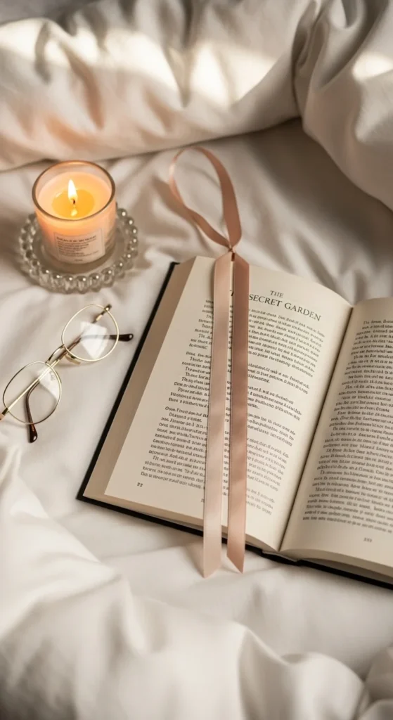 A satin ribbon bookmark feels soft, graceful, and very easy to use. It is one of the quickest ways to make your reading routine feel prettier without doing a big craft project. All you need is a length of ribbon in a color you love. Blush pink, cream, sage, and dusty blue all look especially nice. Cut it a little longer than your book and seal the ends with clear nail polish or a quick pass near heat so it does not fray. You can leave it plain or tie a tiny charm or bead to one end. This style works best for readers who want something light and flexible. It does not damage pages and fits well in novels, planners, or daily journals. Ribbon can often be bought cheaply at craft shops, or you can reuse ribbon from gift wrapping. It is simple, soft, and always looks lovely.
