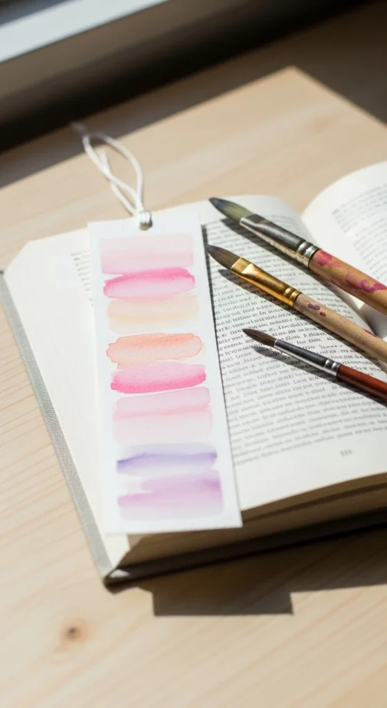 A watercolor bookmark is a nice choice if you want something artistic but still easy. You do not need to be great at painting to make it look good. In fact, soft uneven color is part of the charm. Use thick paper or watercolor paper, then brush on diluted shades like lavender, peach, dusty blue, or sage. Let the colors fade into each other for a soft look. Once dry, trim the paper into bookmark strips and round the corners. You can add a ribbon if you want, but even plain painted paper looks nice. This idea is very budget friendly because one small paint set can make many bookmarks. It is also relaxing to create. Each one turns out a little different, which makes the result feel personal. A watercolor bookmark works well for gift sets, reading journals, or simply adding a calm handmade touch to your current book.