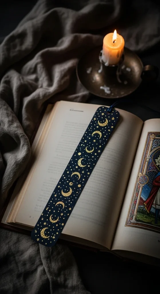 A moon and stars bookmark is lovely if you like dreamy, night-inspired decor. It feels magical without being hard to make. Start with navy, black, or deep plum cardstock. Add tiny painted moons, stars, or dots with metallic paint, a gel pen, or small foil stickers. If you want a softer version, use a pale gray or dusty blue background instead. This style pairs beautifully with fantasy books, journals, and bedtime reading. It is also a nice way to give a little personality to your reading stack without spending much. You can make it more special by adding a tassel in gold, cream, or dark blue. Keep the design clean rather than crowded. A few small details usually look better than too many. This bookmark style feels personal, calm, and slightly moody, which makes opening your book feel like part of a quiet evening ritual.
