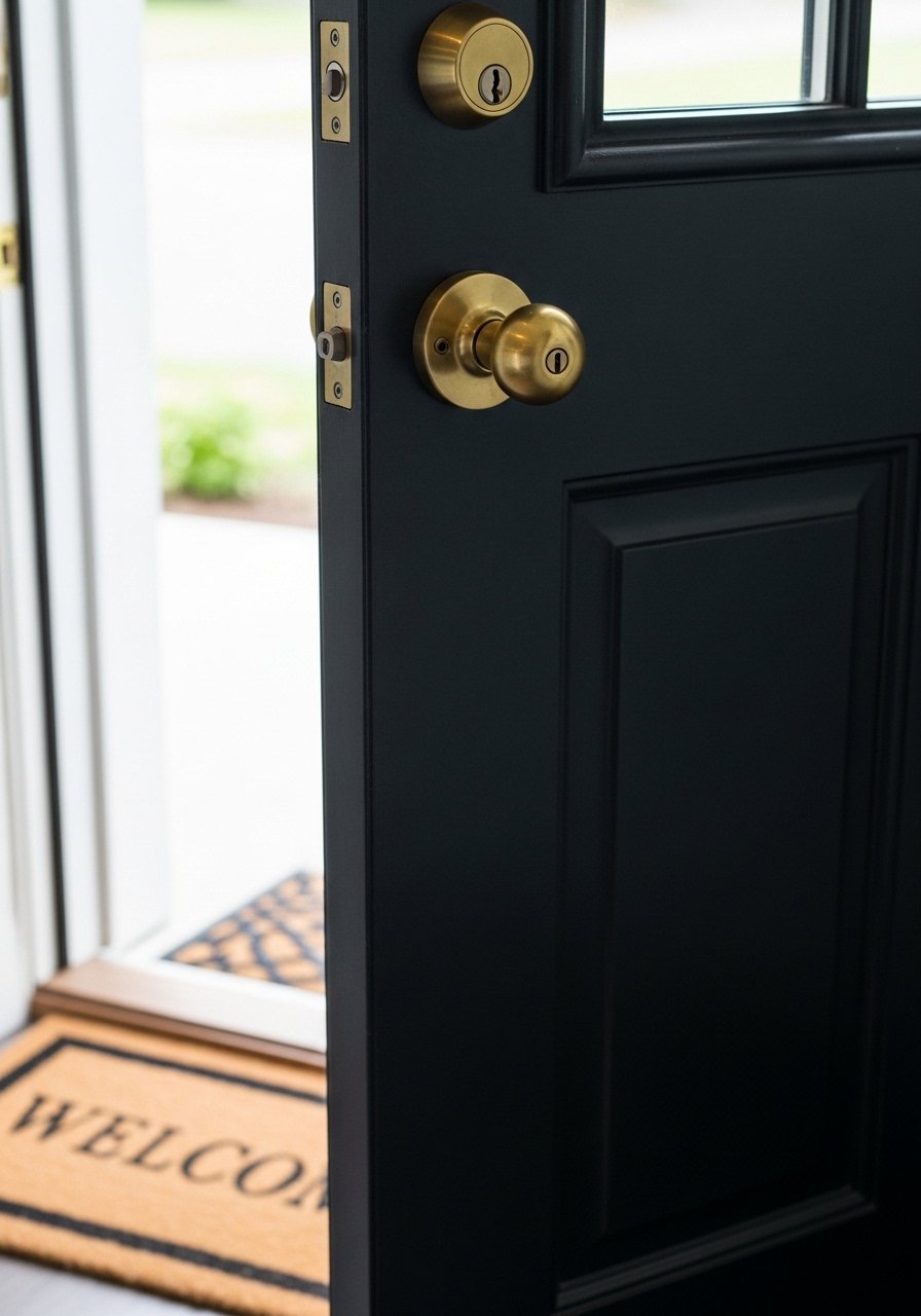 1. Matte Black Front Door with Warm Brass Hardware