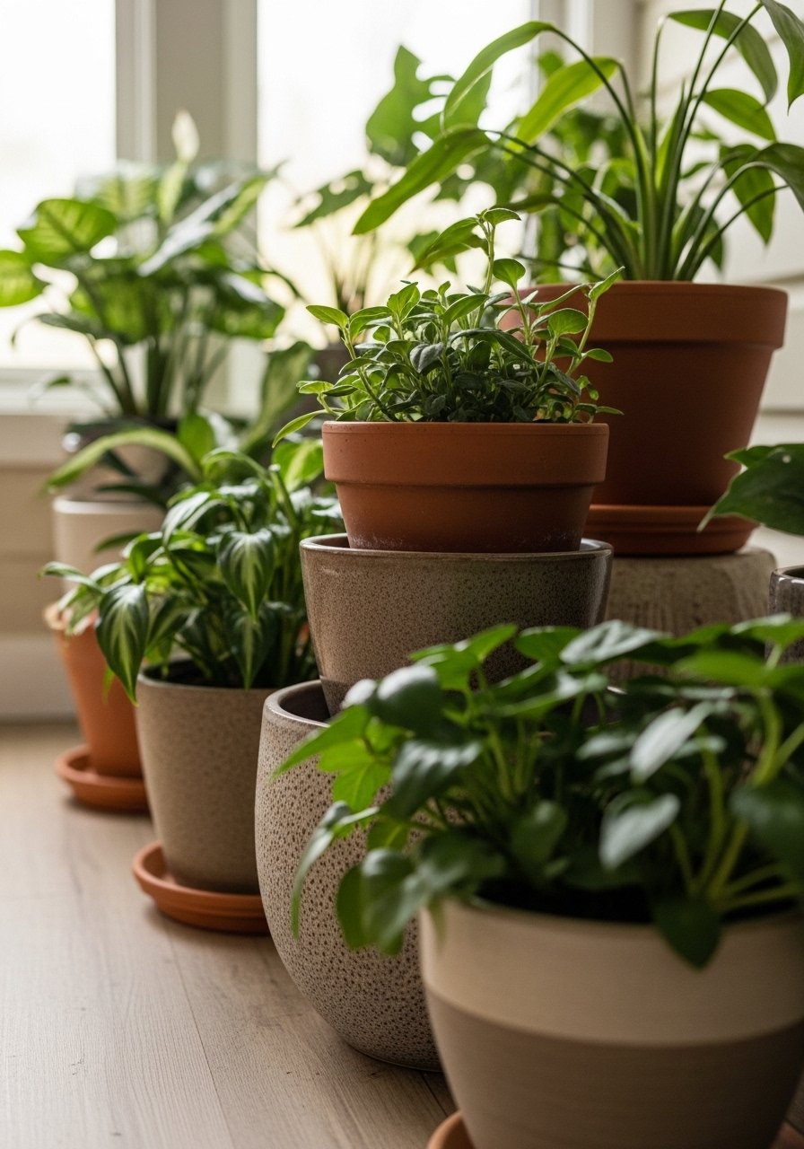 I swapped mismatched pots for a trio of earth-toned ceramics. The color family keeps the look cohesive while still allowing plant variety.