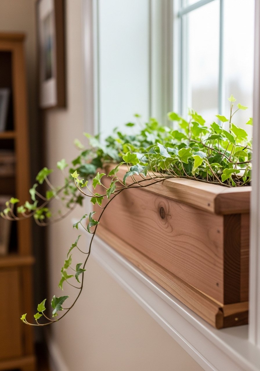 I installed cedar window boxes under front windows and filled them with soft greenery. The texture softens the facade and feels lived-in, not staged.