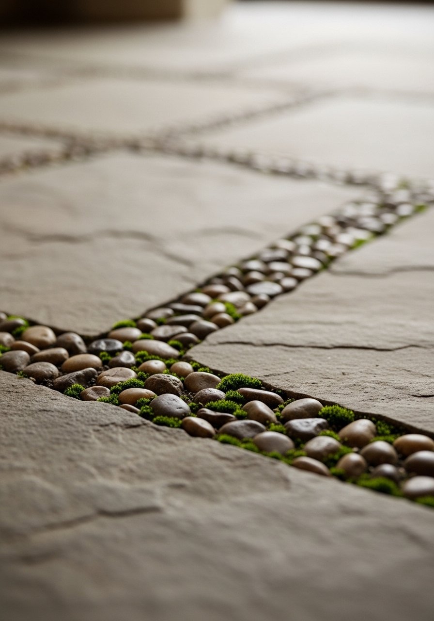 Flagstone breaks up visual weight and helps rainwater drain. The pebble border keeps edges tidy.