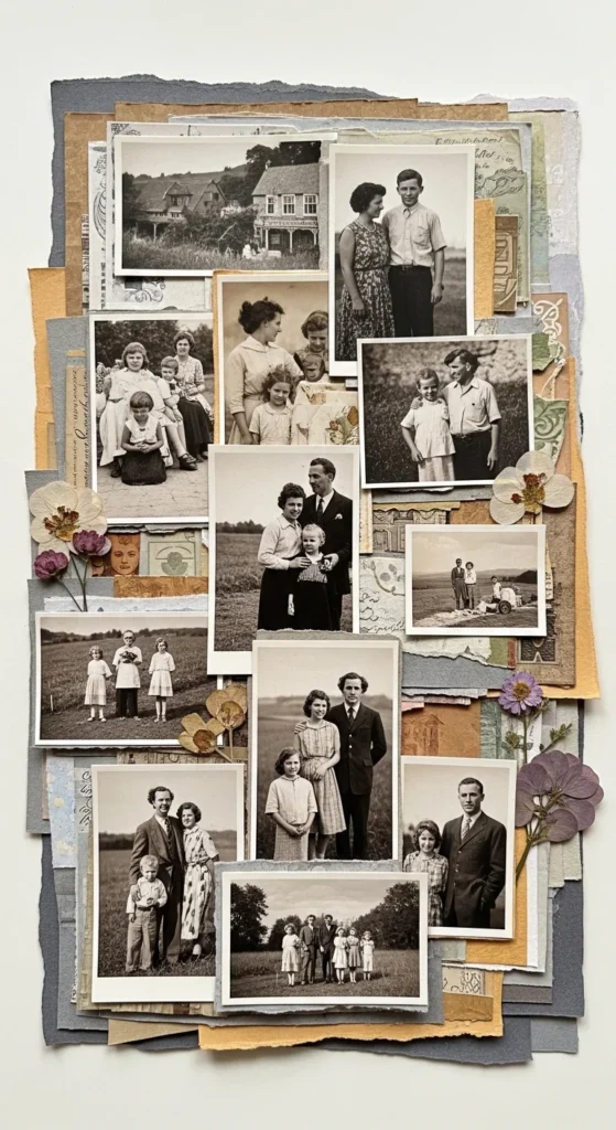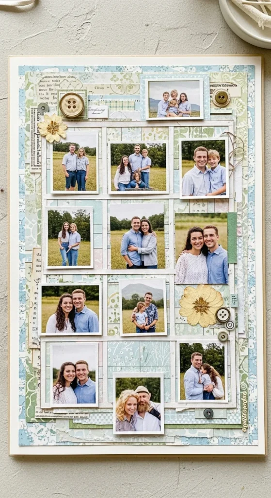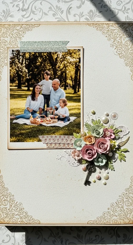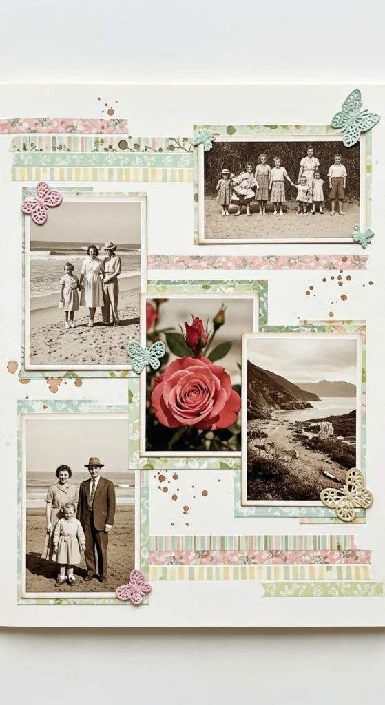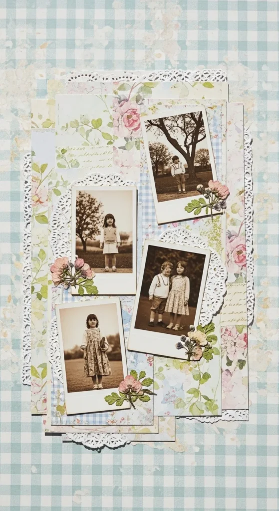 Vintage ephemera layers add story and depth. Gather old-style paper scraps, postcards, ticket stubs, and lace bits. Arrange them in overlapping layers before placing your main photo on top. Slight uneven edges give character. Stick to muted tones like faded pink, brown, and soft blue for harmony. This style feels artistic without needing perfect alignment. It’s ideal for heritage photos, travel memories, or sentimental pages.