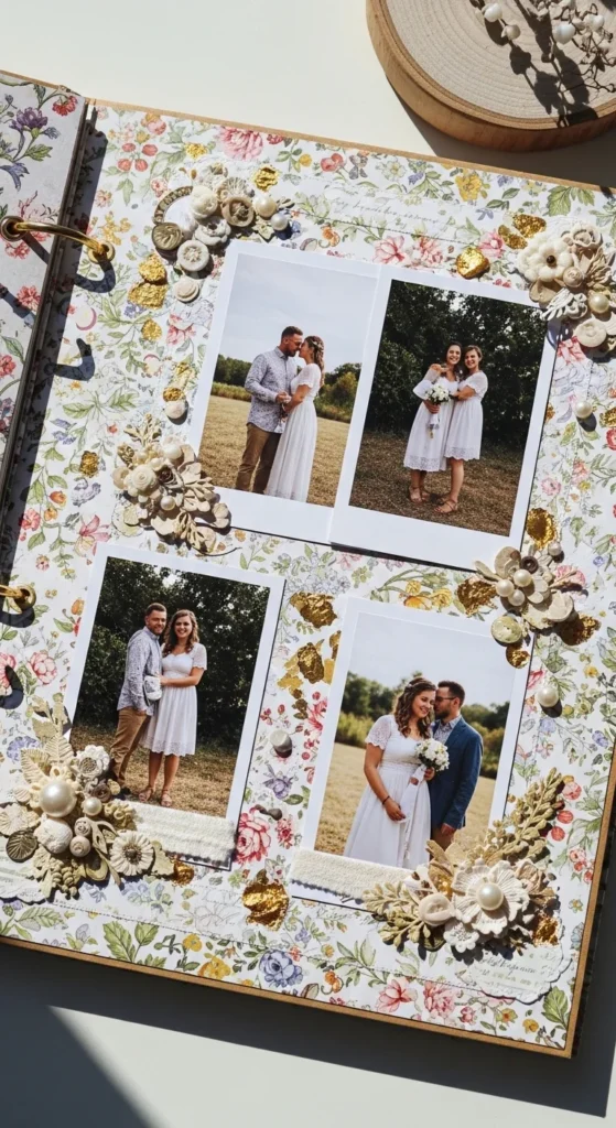 Gold foil accents add a touch of shine without overwhelming the page. Use papers or stickers that have small areas of metallic detail. Place your photos on neutral mats so the foil stands out gently. Add a few gold elements, such as thin borders, tiny stars, or small labels. Keep the rest of the decorations minimal so the shimmer remains subtle. This works beautifully for milestone moments, weddings, or celebrations. The metallic highlights catch the light and make the page feel special. Beginners can achieve this look easily by using pre-made foil stickers or paper packs. A little shine goes a long way in making a scrapbook page feel elegant.