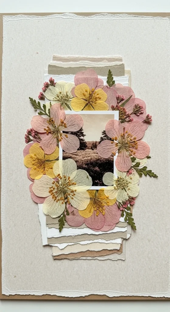 Pressed flowers bring real texture and gentle beauty to scrapbook pages. Dry small flowers or leaves between book pages for several days. Once flat, glue them lightly around your photo using clear adhesive. Keep the arrangement airy rather than crowded. Pair them with plain or lightly textured paper so the natural shapes stand out. This style feels soft and personal, especially for outdoor memories, garden days, or spring events. Beginners like this idea because nature does most of the decorating work. Add a thin paper mat behind the photo to separate it from the organic shapes. The result feels calm, tactile, and visually pleasing without many extra supplies.