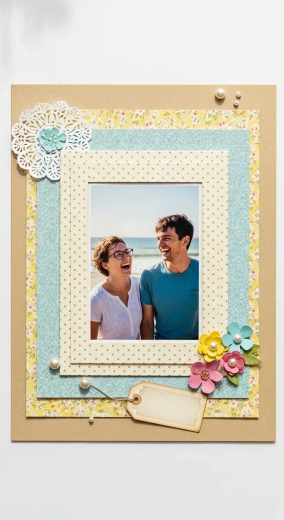 A layered frame stack adds depth using simple paper pieces. Cut several rectangles from different patterned or solid papers. Each layer should be slightly larger than the one above it. Stack them behind your photo so the edges peek out evenly. Stick to two or three colors for a cohesive look. Slightly offset one layer for a relaxed touch. This technique fills space while keeping the focus on the image. It’s a great way to use leftover paper scraps. Beginners enjoy this method because it looks detailed without complicated tools or measuring.