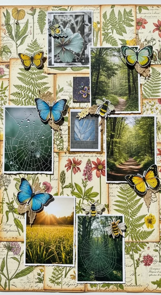Adding small insect motifs alongside florals creates gentle movement and charm. Start with botanical patterned paper as your base. Place your photos on simple mats so they stand out. Add tiny butterfly or bee stickers near the flowers to create a nature theme. Keep the embellishments small and spaced apart. This prevents the page from feeling crowded. The combination feels whimsical yet elegant. It works well for spring, garden, or outdoor adventure memories. Beginners can use pre-made stickers to keep things simple. The natural theme helps guide decoration choices without overthinking.