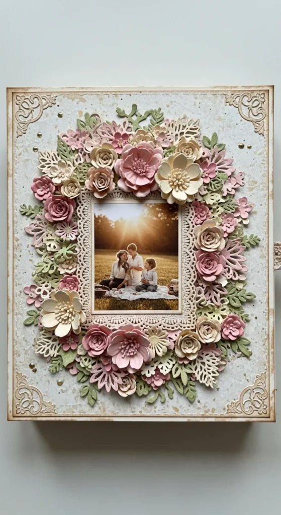 A decoupage-style cover creates a beautiful first impression. Cut out shapes from floral or patterned papers. Layer them around the edges of the cover like a collage. Place one main photo in the center as the focal point. Keep colors coordinated so the cover feels unified. Use glue sparingly to avoid wrinkles. This layered look feels artistic and welcoming. It sets the tone for the scrapbook inside. Beginners enjoy this because cut-out shapes are easy to arrange and adjust. The cover becomes a preview of the memories that follow.
