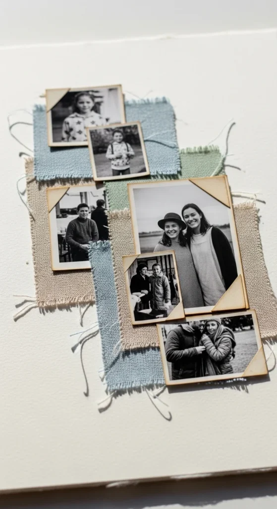 Small fabric pieces add softness and depth to scrapbook pages. Cut thin strips from old fabric scraps like cotton or linen. Layer them behind your photos as textured mats. Keep colors subtle so they don’t overpower the design. Fabric adds dimension without heavy embellishments. Pair it with simple paper backgrounds to keep the page balanced. This idea works well for cozy home memories, baby pages, or handmade themes. Beginners like it because fabric pieces don’t need perfect edges. The texture adds interest naturally.