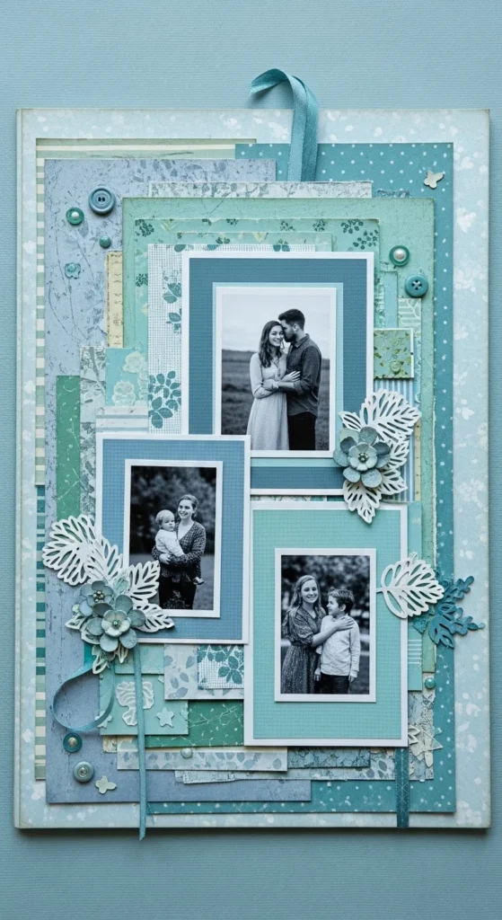 A neutral palette makes every page feel calm and cohesive. Choose papers in shades like beige, cream, and soft grey. Layer photos on slightly darker mats so they don’t blend into the background. Add texture with fabric scraps, twine, or kraft paper pieces. Keep embellishments minimal and in similar tones. This approach allows the photos to carry the emotion while the background supports the mood. Beginners find this palette easy because color matching becomes simple. The result feels timeless and easy to build upon later.