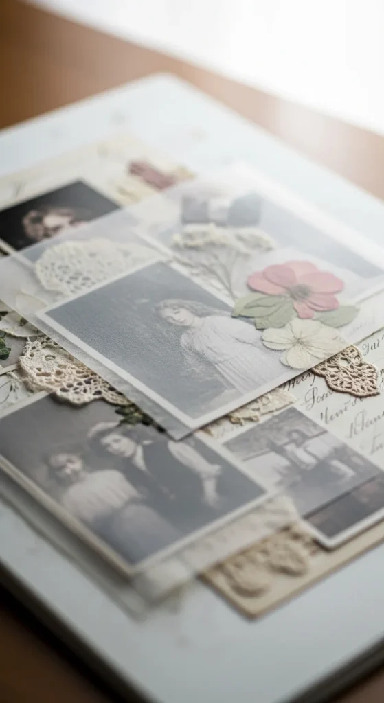 Vellum overlays add softness and a dreamy feel. Place a piece of vellum over part of your page. Tuck small photos or decorations underneath so they show through gently. Secure the vellum at the edges with tape or brads. Keep the background simple so the transparent layer stands out. This technique adds depth without heavy layering. It works well for romantic, calm, or reflective themes. Beginners can try this with tracing paper if vellum isn’t available.