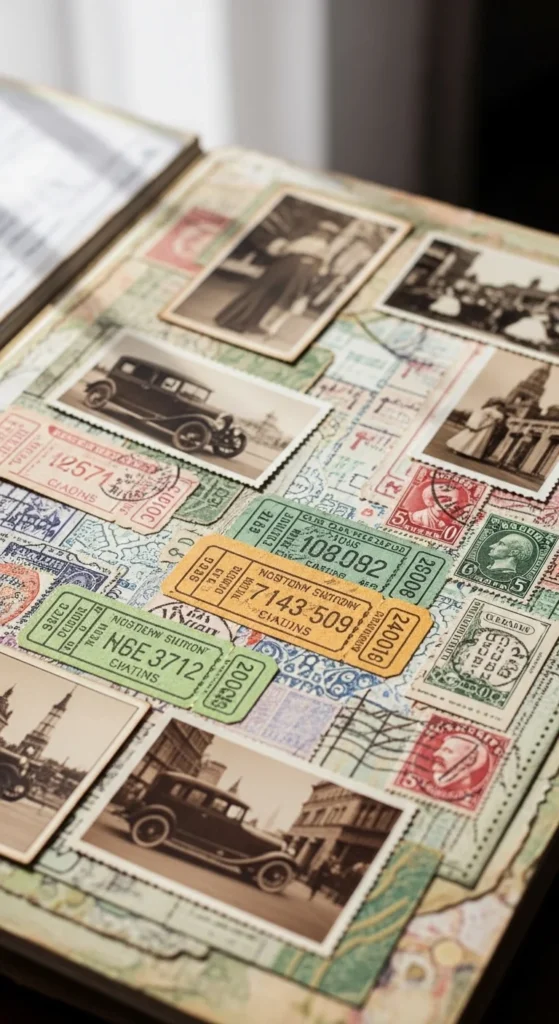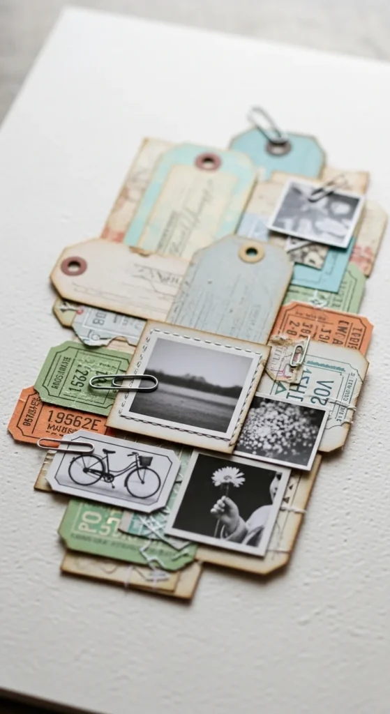 Cluster small tags and tickets to create a storytelling corner. Arrange them in overlapping layers near your photos. Keep the cluster on one side of the page to maintain balance. Use a neutral background so the pieces remain visible. Add a short handwritten note on one tag. This layout captures memories in a personal way. It’s ideal for travel, events, or everyday moments. Beginners find this style forgiving because uneven edges add character.