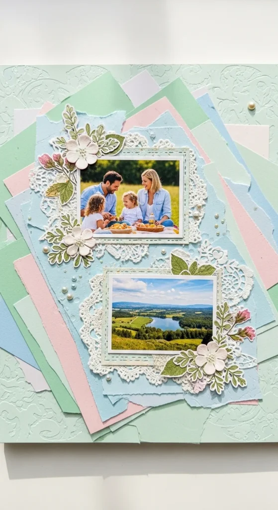 Pastel palettes create a gentle and soothing aesthetic. Use papers in soft pinks, blues, yellows, or lavender. Layer photos on white or light mats for contrast. Add tiny embellishments like dots or mini flowers. Keep everything light and airy. This style works beautifully for friendship, baby, or spring memories. Beginners enjoy this palette because the colors naturally blend well together.