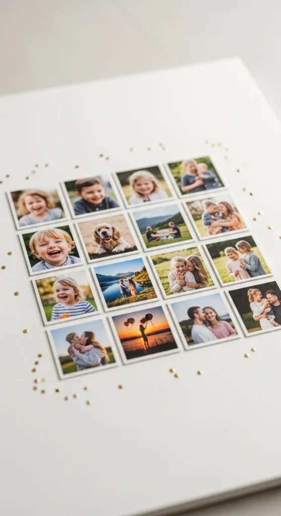 A clean photo grid paired with small gold dots creates a modern aesthetic. Trim photos into equal sizes and arrange them in straight rows. Leave small gaps between each photo. Add tiny gold dot stickers in a few open spaces for subtle sparkle. Keep the background neutral so the grid stands out. This design feels tidy and stylish. Beginners appreciate the structure of a grid layout. The small metallic details add charm without overwhelming the page.