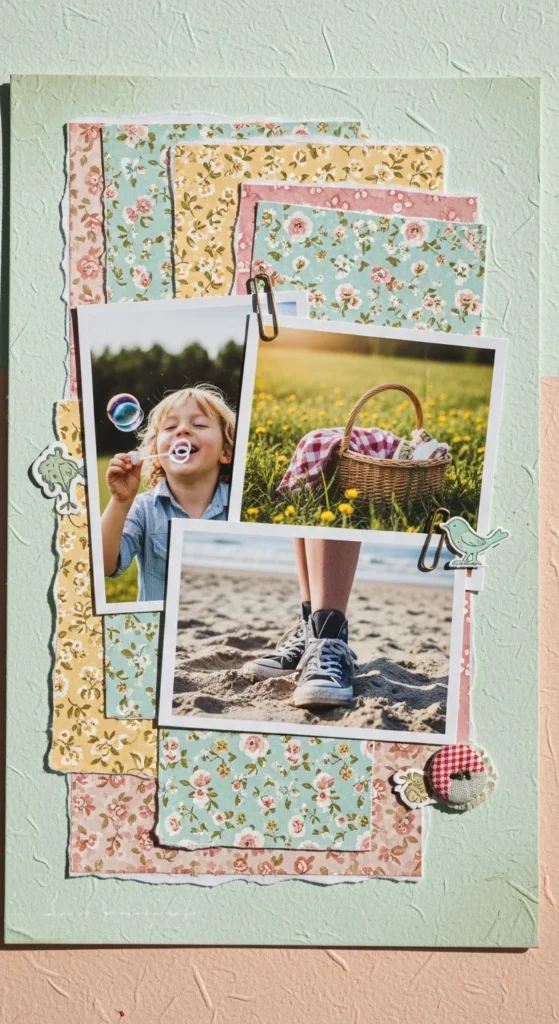 Pairing gingham with botanical prints creates a page that feels structured yet soft. Start with gingham as the base since its grid pattern adds quiet order. Layer a piece of floral paper behind your photo cluster to introduce organic movement. Keep colors within the same family, such as sage green and cream, so the patterns feel connected. Add a thin paper frame around your photos to help them stand out. Leave some open space so the patterns don’t compete for attention. This combination works well for outdoor memories, spring photos, or cozy home moments. It looks detailed but comes together with just two patterned papers and simple layering.