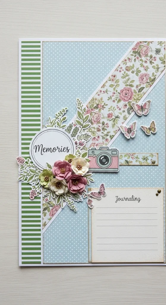 Ditsy floral prints add a gentle, romantic touch to scrapbook pages. These tiny scattered flowers work best as soft overlays rather than bold backgrounds. Start with a plain cardstock base in a light color. Add a strip or panel of ditsy floral paper along one side or corner of the page. This keeps the pattern subtle and balanced. Place your photos on top of solid mats so they don’t get lost among the tiny prints. Keep embellishments simple, such as small dots or thin borders. The small-scale pattern creates texture without taking over the design. This layout feels light and calm, making it perfect for everyday memories, spring photos, or friendship pages. Beginners find this approach easy because the pattern does the decorating work without needing many extra elements.