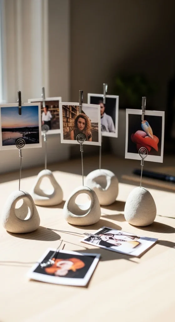 Photo holders combine clay and simple wire. Shape a small round or cube base from clay. Insert a short piece of bent wire into the top while the clay is still soft. Make sure it stands straight. Let the base dry fully before adding paint. These holders are perfect for desks and gifts and help beginners work with mixed materials in a simple way.