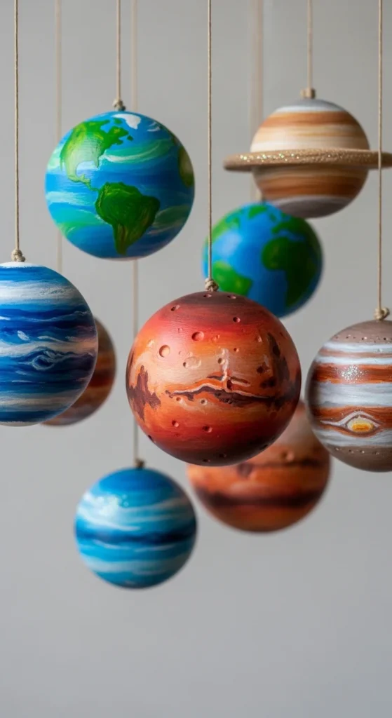 Hanging planets are simple spheres with added lines or rings. Roll clay into smooth balls and poke a small hole for string before drying. Add gentle line textures for planet rings. After drying, paint in blues, purples, or soft tones. Hang them near a window or desk for playful decor. This project helps beginners practice smooth rolling.