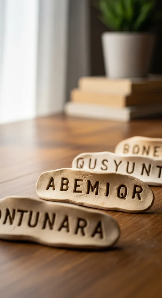 Clay name plates are simple flat projects that feel thoughtful and personal. Roll clay into an even slab using a smooth bottle if you do not have a roller. Cut a small rectangle and smooth the edges with a damp finger. Press letters into the surface using alphabet stamps, or gently carve them with a toothpick. Keep the lettering large and clear so it stands out after painting. Let the plate dry flat and turn it occasionally so it does not curl. Once hardened, paint the background in a soft color and brush a darker shade lightly over the letters to make them visible. These name plates are great for desks, shelves, or gift tags and help beginners practice working with flat clay and surface lettering.