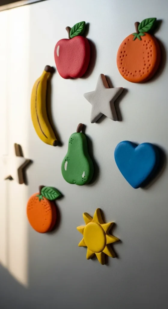 Fridge magnets are quick, small projects that are perfect for practicing flat shapes. Roll clay thin and cut simple forms like hearts, leaves, or circles. Smooth the edges carefully so they do not crack while drying. Press a small magnet gently into the back while the clay is still soft, making sure it sits flush. Let the shapes dry flat on a smooth surface and turn them occasionally. After they harden, paint them in bright or pastel shades and add tiny details with a fine brush. These magnets add personality to your kitchen and help beginners practice shaping thin clay pieces and attaching small components.