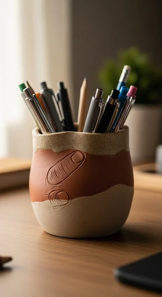 A pen holder is a practical project that teaches hollow forms. Start with a thick cylinder shape and press your thumb slowly into the center while turning the clay. Keep the walls even and not too thin to prevent cracks. Smooth the outer surface with a damp finger. Let the holder dry upright and rotate it every few hours during the first day. After it hardens, paint it in neutral tones or add simple patterns around the outside. This pen holder keeps your desk tidy and helps beginners practice shaping stable hollow containers.