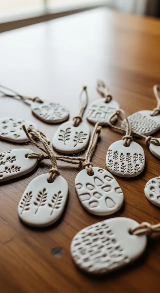 Clay keychain tags are flat and simple to decorate. Roll clay to an even thickness and cut small shapes like circles or rectangles. Press stamps, lace, or textured objects into the surface. Poke a hole near the top for a keyring. Smooth edges before drying. After hardening, paint in soft tones and seal lightly. Attach to a keyring or bag. These tags make great handmade gifts and help beginners practice cutting shapes and adding surface patterns.