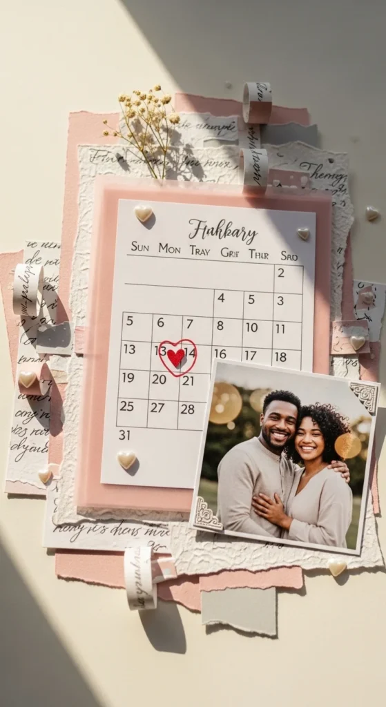 A first date calendar page is a lovely way to begin an anniversary scrapbook because it gives your story a clear starting point. Print or draw a small calendar for the month you first went out, then circle the exact day with a pen, stitched heart, or little paper marker. Add one photo from that time if you have one, or use a later photo and write a note about what you remember from that day. You can mention where you went, what you ate, what you wore, or how nervous and excited you felt. Those small details bring the page to life. This idea works well because it does not cost much and still feels deeply personal. Plain printer paper, one printed photo, and a few scraps of colored cardstock are enough. If you want a softer romantic look, use blush, cream, sage, or dusty rose tones. A handwritten caption often feels warmer than stickers or printed text. This page helps the scrapbook feel like a real love story instead of just a collection of pictures, and that makes it a strong opening for the rest of the album.