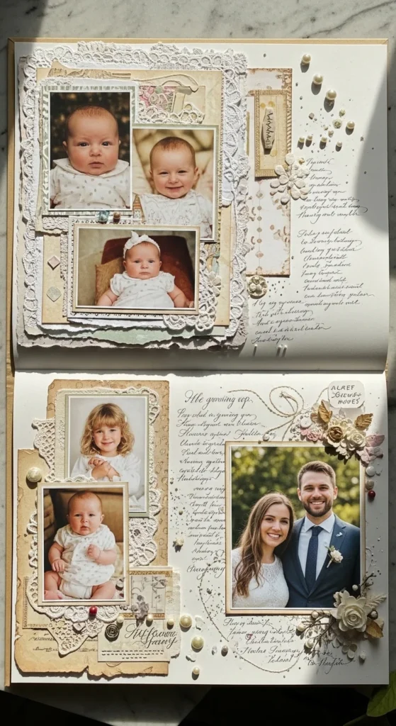 A then and now page creates a touching contrast between the past and the present. Use one childhood or early-life photo from each person, then place a current photo of the two of you together beside them. The emotional effect is simple but strong. It shows how two separate lives eventually became one shared story. You can write a few lines about how strange and lovely it feels that two younger versions of you had no idea what was waiting ahead. This kind of page does not need much decoration because the photos already say a lot. A clean layout with soft mats, handwritten dates, and one short note is often enough. If childhood photos are hard to find, use any older individual pictures from before you met. This is also an affordable page because it relies more on storytelling than supplies. A simple cream background and black pen can make it feel beautiful. This idea works well in anniversary scrapbooks because it adds reflection and emotional depth without becoming heavy. It quietly honors time, growth, and the way love can join two very different paths.