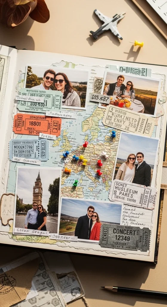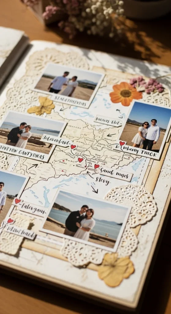 A special trip page is perfect for an anniversary scrapbook because travel memories often hold so many emotions in one place. Choose one meaningful trip, whether it was your honeymoon, a weekend getaway, or even a small road trip to a nearby town. Add two or three favorite photos, then include little details like what you ate, what the weather felt like, something funny that happened, or the place you both kept talking about afterward. If you saved a train ticket, boarding pass, museum receipt, hotel card, or map piece, tuck it onto the page. These real objects make the scrapbook feel richer and more personal. A torn map background or a postcard-style layout works especially well. For a low-cost version, print a tiny map screenshot and use plain kraft paper as the base. You do not need a luxury trip for this page to feel beautiful. Even a simple day trip can become a meaningful memory when you pair it with photos and handwritten details. This page celebrates not just the place, but the feeling of being together there.