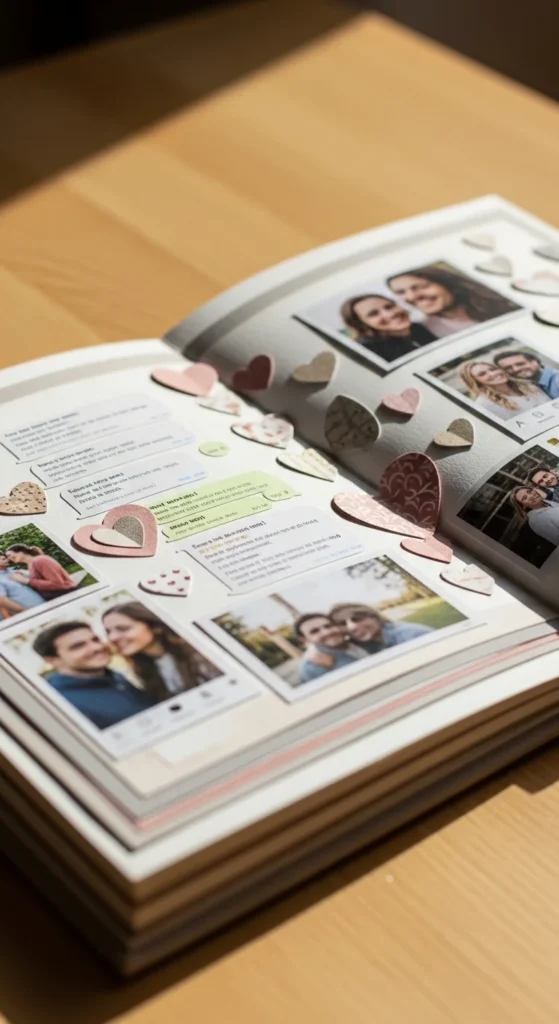 A page made from sweet text messages can feel surprisingly emotional because small digital moments often carry real warmth. Screenshot a few messages that still make you smile, such as the first time one of you said something extra cute, a funny exchange from a difficult day, or a supportive message that stayed in your memory. Print them small and arrange them on the page with one or two photos. You can add short notes about where you were when the messages came through or why they still matter. This page is especially lovely for modern relationships because so much affection lives in messages now. It brings those fleeting moments into a physical form. A budget-friendly version is easy. Print the screenshots in black and white and mount them on plain cardstock scraps. Add hearts or little arrows with a pen. This scrapbook idea works because it celebrates everyday connection, not just formal milestones. It shows how love often grows through check-ins, jokes, encouragement, and little words sent between busy parts of life. That makes the page feel intimate, current, and very real.