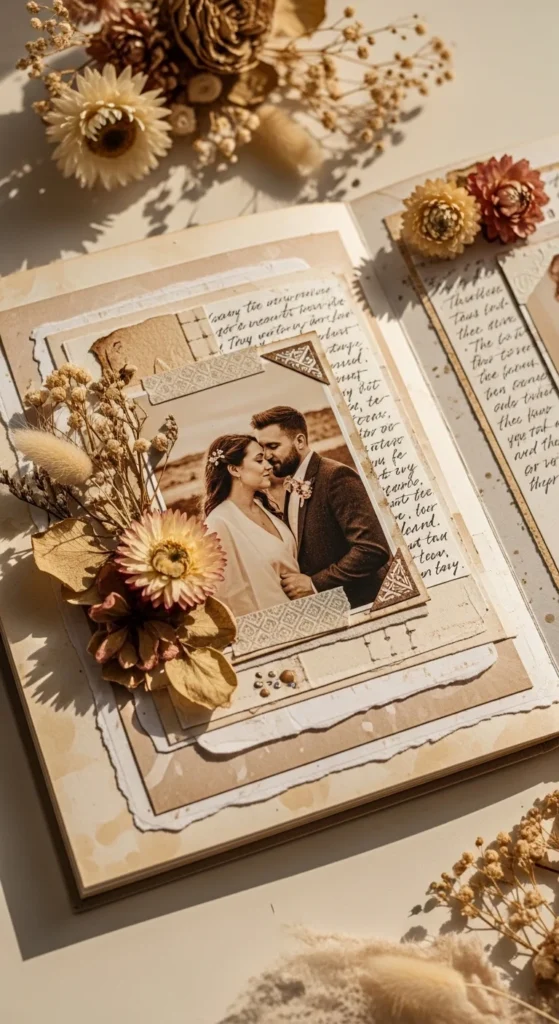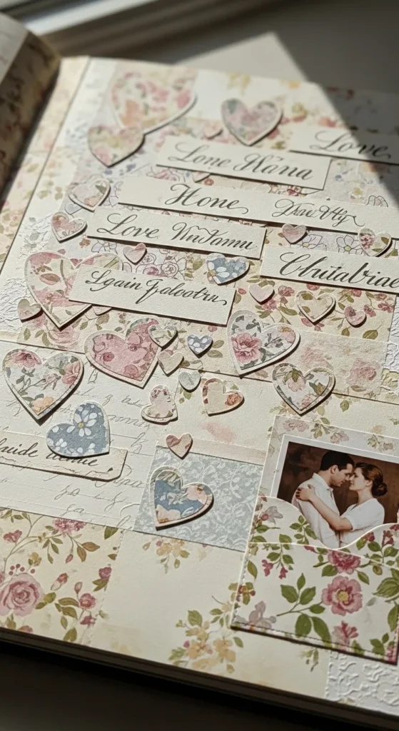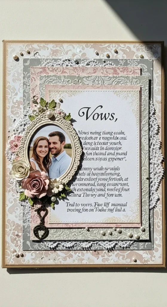 A vows or promises page adds tenderness and depth to an anniversary scrapbook, especially if you are celebrating a wedding anniversary. If you still have your vows, print a few lines from them and pair them with a favorite wedding photo. If you are not married, write a few personal promises instead. These could be quiet promises about support, patience, laughter, honesty, or growing together through every season. The page does not need to be formal. It just needs to feel true. Handwritten text can make it even more emotional because it feels direct and personal. You can keep the design soft and simple with one photo, one block of writing, and a few paper accents like hearts, lace edges, or dried flower pieces. For a low-cost approach, use plain cream paper and your own handwriting rather than printed embellishments. This page works so well because it captures commitment in words, not just images. It gives the scrapbook a steady emotional center and reminds your partner that love is not only remembered, it is also chosen again and again.