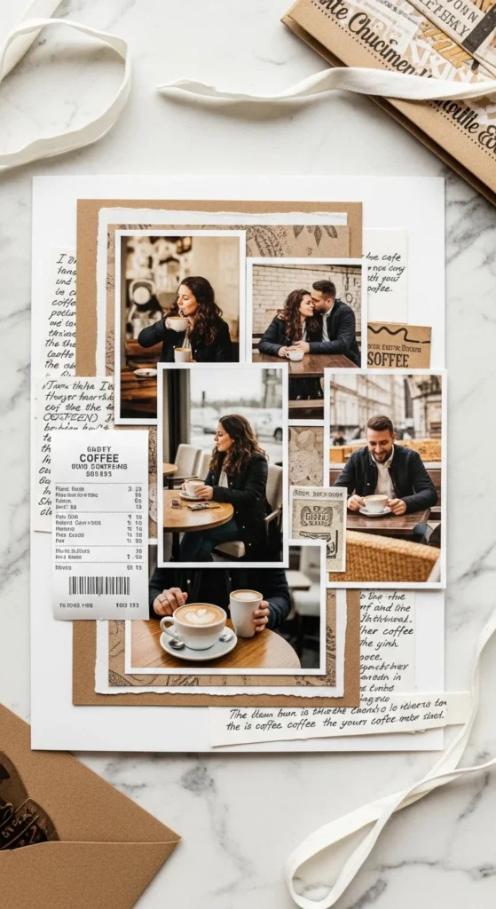 One of the sweetest anniversary scrapbook ideas is a page about a small routine you share. This could be Sunday morning tea, evening walks, late-night snacks, grocery shopping together, watching a series on the couch, or stopping by the same café every week. These habits may seem ordinary, but they often carry the strongest sense of togetherness. Make the page around one routine and explain why it matters. Add one or two casual photos, then include tiny details like what you usually order, who always forgets something, or the phrase one of you always says. These details make the page feel warm and familiar. A low-cost layout works perfectly because this idea is more about memory than decoration. Use notebook-style lines, soft paper scraps, and handwritten journaling. You can also add a small receipt or a little doodle of the object tied to the routine, like a mug or a blanket. This page is beautiful because it celebrates love in repetition. It shows that romance is not only found in special events. It also lives in the things you do together all the time.