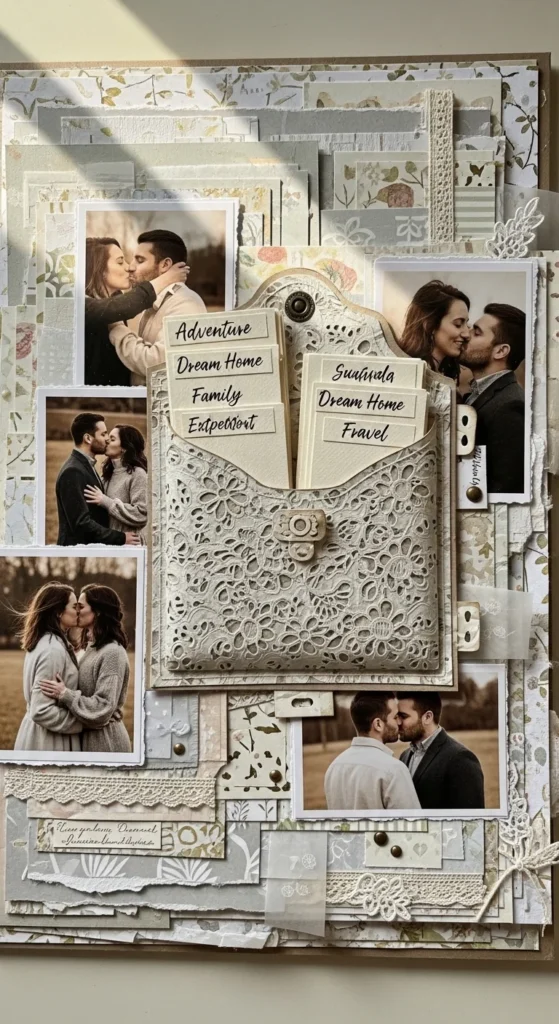 If you and your partner have ever exchanged anniversary cards, birthday notes, or tiny handwritten messages, a saved cards page can become one of the most personal parts of the scrapbook. Use full cards if they fit, or trim meaningful sections and layer them onto the page with photos. Even one little line in your partner’s handwriting can make the page feel deeply emotional. You can mix old and new notes on the same spread and write a caption about how the words still feel years later. This is also a smart way to use keepsakes that would otherwise sit hidden in a drawer. The page does not need much decoration because the paper pieces already carry meaning. A low-cost design could be as simple as white cardstock, black pen, and a few photo corners. If some cards are bulky, photograph them and print smaller copies. This page works beautifully because handwriting feels human and direct. It gives the scrapbook a voice, not just images. That makes the whole album feel warmer, closer, and much more intimate.