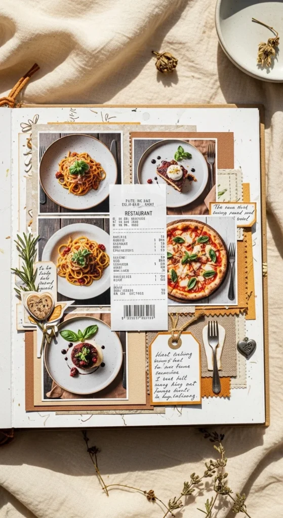 Food memories can be deeply emotional, which makes them perfect for an anniversary scrapbook. Build a page around a favorite meal you shared, a recipe you always cook together, or a restaurant that matters to your story. Add a photo of the meal, a receipt, a handwritten recipe card, or just a short note about why that food became special. Maybe it was the first dinner you cooked together, a dessert you always order, or the comfort meal one of you makes on hard days. Those details make the page feel intimate and familiar. You can use warm earthy colors like cream, brown, muted red, or sage to make the layout feel cozy. A low-cost version is easy because one printed food photo and a handwritten memory can carry the whole page. This scrapbook idea is lovely because food often sits inside love in a quiet way. Meals become routines, traditions, celebrations, and comfort all at once. Capturing that on paper gives the scrapbook warmth and a very lived-in feeling.