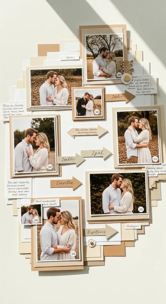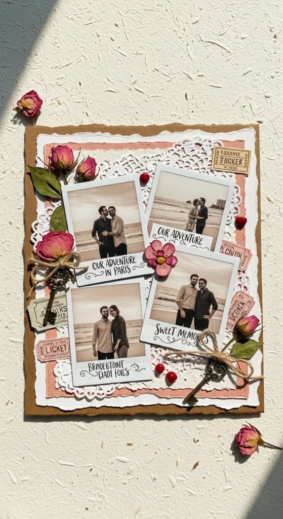 A Polaroid-style collage is perfect when you have many photos you want to include without making the page feel crowded. Print small square photos with white borders or create the look using paper mats. Arrange them across one or two pages and add tiny captions underneath like rainy day drive, first apartment dinner, beach sunset, or your sleepy face here. The white bordered style makes the layout feel clean and timeless, even when the photos are casual. This scrapbook idea is especially good for anniversary albums because it lets you show lots of memories at once while still keeping a romantic handmade feel. You can tuck in a few small paper hearts, date stamps, or little notes between the photos. For a low-cost option, print wallet-size images and cut plain white paper behind them to fake the Polaroid look. This page works because it feels relaxed and memory-rich at the same time. It turns many separate moments into one loving visual collection, and that makes the scrapbook feel fuller without becoming heavy or overdone.