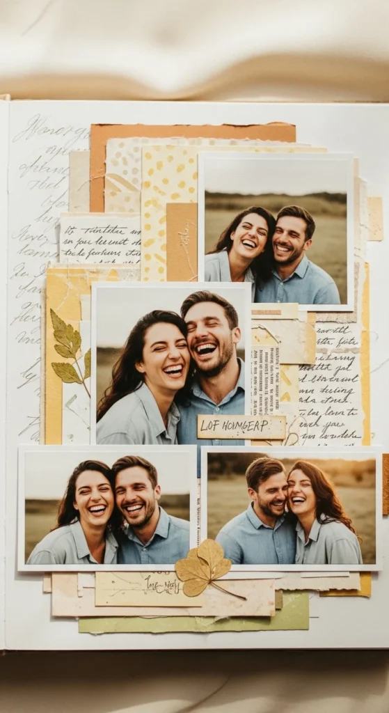A laughing moments page brings lightness and life into an anniversary scrapbook. Pick photos where you are laughing, being silly, caught off guard, or just having one of those happy imperfect moments that feels real. These candid pictures often end up more meaningful than posed portraits because they show how love looks in motion. Add short captions about what was happening in each photo. Maybe someone spilled a drink, made a bad joke, got lost, or could not stop laughing at something tiny. Those moments matter because they show the comfort and joy inside the relationship. You can arrange the page like a mini collage with handwritten notes scattered between the photos. If you want a low-cost layout, print smaller photos and place them close together on plain cardstock. Let the expressions do the work. This page is beautiful because it celebrates happiness in a relaxed, natural way. It reminds both of you that love is not only serious or sentimental. It is also fun, playful, and full of shared laughter that keeps the relationship feeling alive.