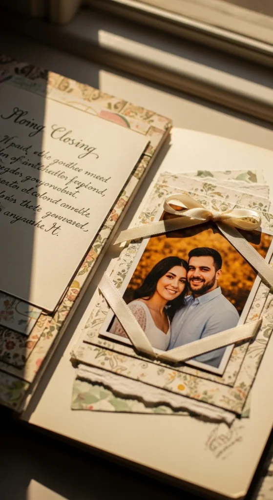 A closing letter page is one of the best ways to end an anniversary scrapbook because it gathers everything into one final heartfelt message. Write a letter to your partner about what this relationship means to you now. Mention what you are grateful for, what memories still stay close, what you admire most, and what you hope for in the years ahead. The tone can be romantic, simple, emotional, or even lightly funny as long as it sounds true to you. Pair the letter with one favorite photo, perhaps one that feels calm and deeply connected rather than overly posed. Keep the design soft and uncluttered so the words remain the focus. A low-cost version works beautifully here. Use plain cream paper, your own handwriting, and one photo printed at home or at a simple shop. This page often becomes the emotional heart of the whole scrapbook because it turns all the photos and keepsakes into one clear expression of love. It closes the album with warmth, honesty, and a feeling that the story is still continuing.