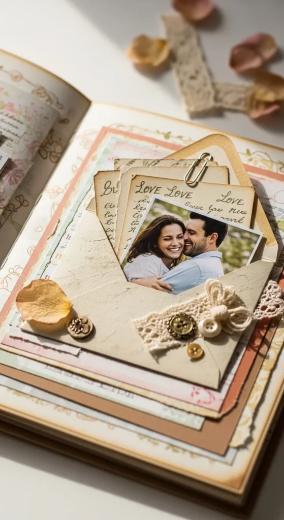 A mini love letter pocket page adds a sweet interactive touch to an anniversary scrapbook. Attach a small envelope, folded paper pocket, or handmade sleeve to the page, then tuck in one or more short notes written for your partner. These can be tiny love letters, memory slips, favorite things about them, or messages for the future. The best part is the surprise of pulling something out and reading it. That little motion makes the page feel special without making it complicated. You can decorate the pocket with lace paper, ribbon, soft cardstock, or even a stamped seal if you want a romantic look. If you want to keep it budget friendly, fold a pocket from scrapbook paper scraps or plain printer paper and glue it down. Add one printed photo next to it and a short caption like open me, read this later, or a note just for you. This idea works especially well if your scrapbook has a handmade, intimate style. It gives your partner something to physically unfold and keep, which makes the memory feel more alive than a flat page alone.