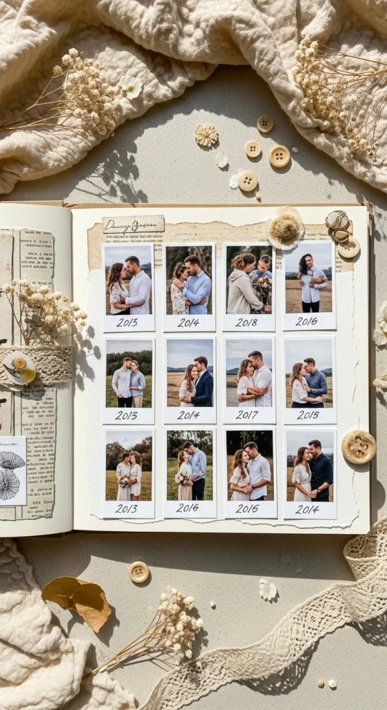 A year-by-year photo grid is a great anniversary scrapbook idea when you want to show change, growth, and shared history in a simple visual way. Pick one photo from each year of your relationship and arrange them in order across one or two pages. The photos do not have to be formal. Casual selfies, blurry vacation shots, dinner pictures, and little everyday moments often make the page feel more alive. Write the year below each photo and add one short sentence about that period. You can mention where you lived, what you were learning together, or what made that year special. This page looks organized and meaningful without needing many supplies. A plain white or beige background with black ink and soft paper mats is enough to make it feel polished. If you want a handmade look, draw the borders instead of cutting extra cardstock. This layout is especially moving because it quietly shows how love changes over time while still staying rooted in connection. It works beautifully for milestone anniversaries and helps the scrapbook feel reflective, warm, and full of shared history.