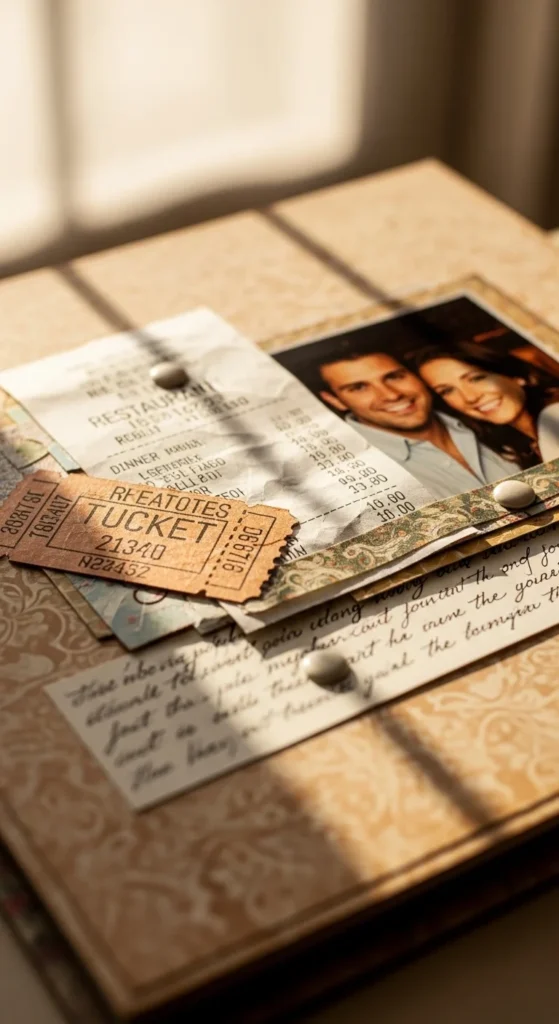 Tickets and receipts may seem small, but they often hold some of the strongest memories. A saved tickets page is a beautiful anniversary scrapbook idea because it celebrates the ordinary moments that built your relationship. Add a movie ticket, concert stub, coffee receipt, museum pass, or restaurant bill from a memorable date. Pair it with one photo and a few lines about why that day still matters. You might remember laughing through a bad movie, ordering too much dessert, or walking home late after the show. These details make the page feel alive. You can arrange the items in a collage style or place them neatly in rows with little captions underneath. If the originals are faded or fragile, scan or photograph them and print copies. This keeps the page looking neat while protecting the real keepsakes. A low-cost trick is to use plain kraft paper or notebook paper as a base and let the mementos be the decoration. This page works well because it proves love is made from everyday outings too, not just big events. That makes the scrapbook feel honest, warm, and deeply personal.