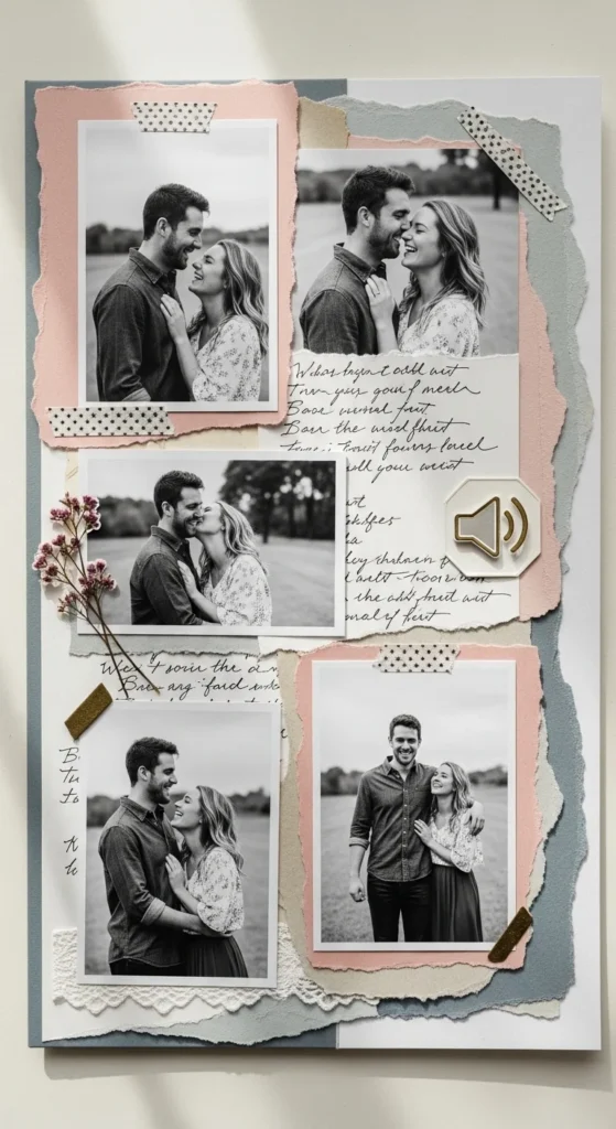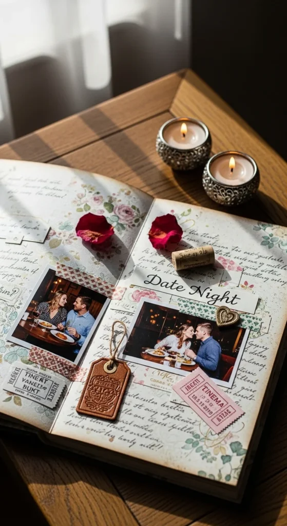 A favorite date nights page is a charming way to celebrate the small rituals that shape a relationship. Instead of focusing only on major milestones, use this page to remember the evenings that felt ordinary but special. Add pictures from dinner dates, movie nights, walks, coffee runs, late-night drives, or homemade meals shared at home. You can format the page like a list of top five date nights, or build it around one especially meaningful evening. Include little details like what you ordered, the weather, what you both wore, or what one of you said that still makes you smile. Those tiny things make the page feel real. A low-cost approach is to print small photos in black and white and decorate with handwritten captions instead of many extras. Use one soft patterned paper and let the words do the emotional work. This scrapbook page is beautiful because it honors love in daily life, not just in dramatic moments. It reminds both of you that the relationship was built through time spent together again and again, often in simple ways that still turned into lasting memories.