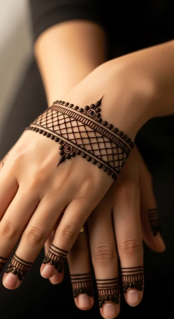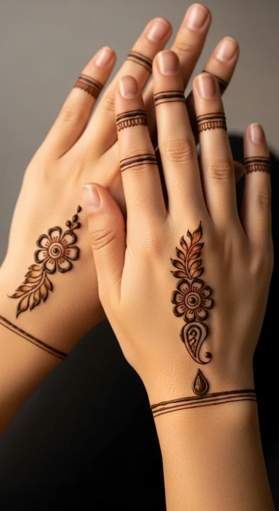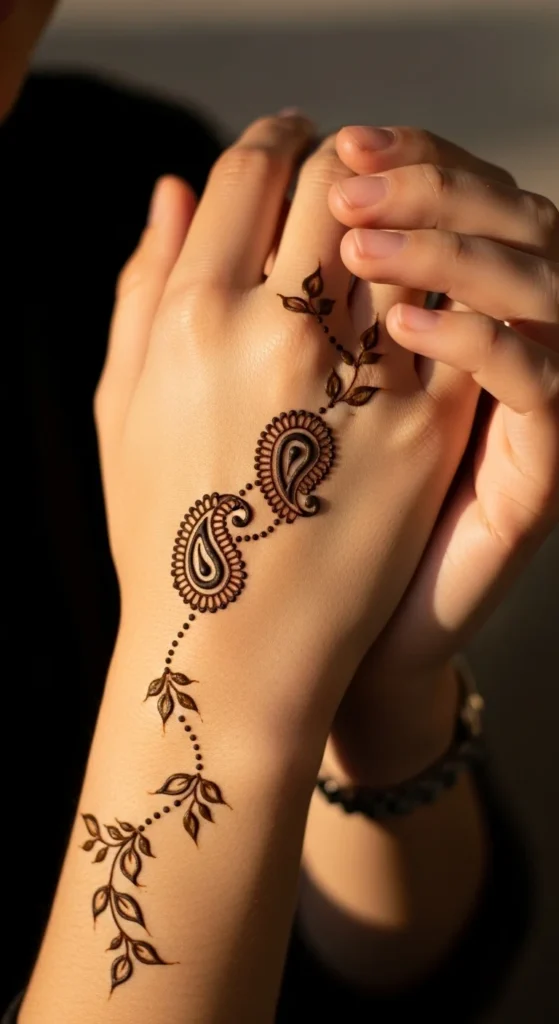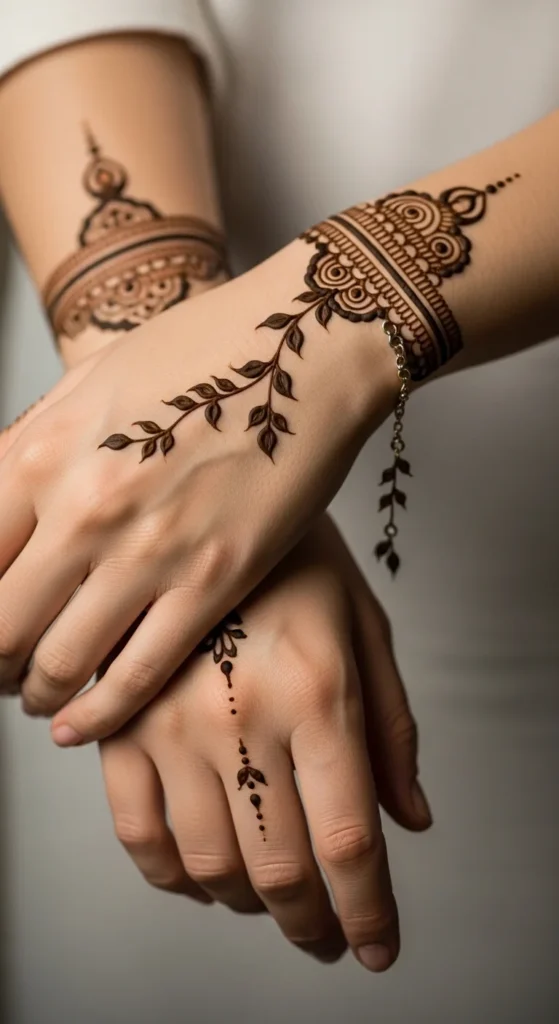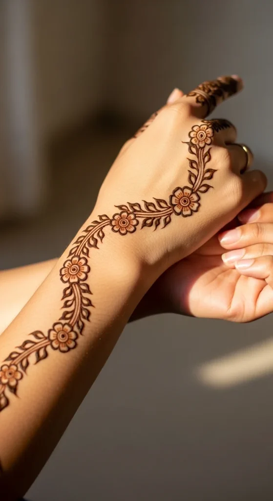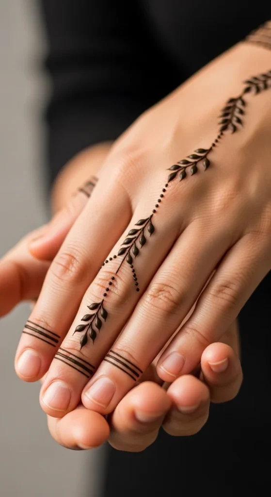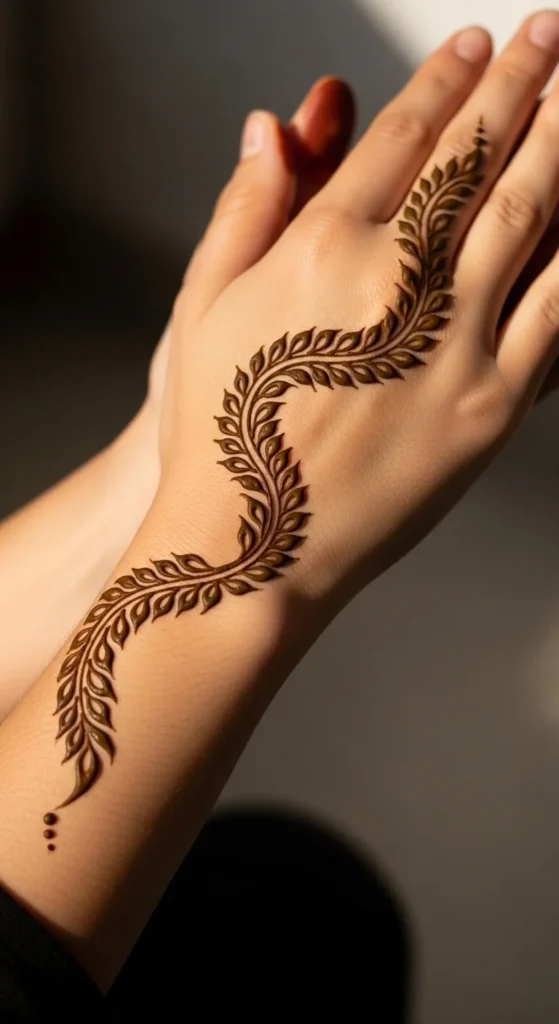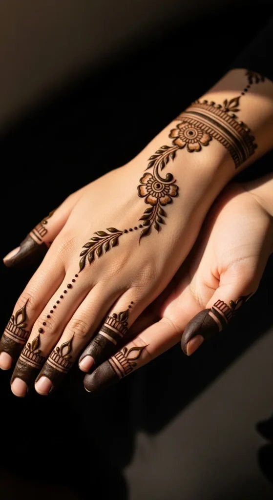 This looks like a delicate bracelet with a charm, which is why it always stands out. Draw a thin band around the wrist using small loops or tiny scallops. In the center, add a short hanging vine that ends in a leaf or teardrop shape. Keep the band light and consistent so it looks jewelry-like rather than heavy. This design works beautifully with festive outfits because it frames the wrist area and adds a styled detail without covering the palm. It also feels balanced when you keep the back of the hand mostly empty. To make it look extra clean, keep the hanging vine straight and centered. A few tiny dots around the charm area can make it look more finished, but stop before it becomes dense. The result is simple, elegant, and very photo-friendly.