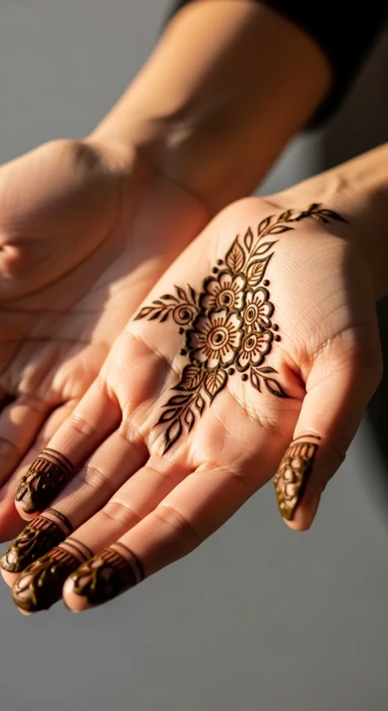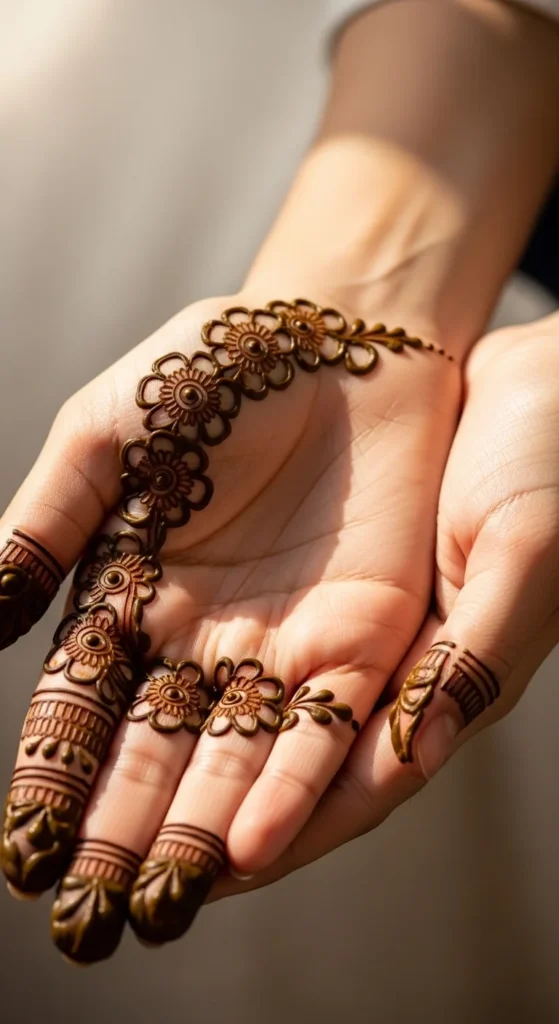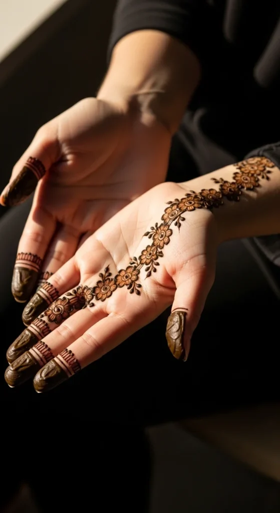 A palm-edge floral lace design stays simple but looks very pretty when you gesture or hold something. Place a line of small flowers along the thumb-side edge of the palm. Connect them with a thin vine and add small leaves in between. Keep the flowers small so the lace stays neat. This stands out because it’s placed on the edge, giving a stylish peek effect. Keep the center of the palm empty. This makes the design comfortable and clean, while still looking festive. A few dots near the ends can give a tidy finish without making it dense.